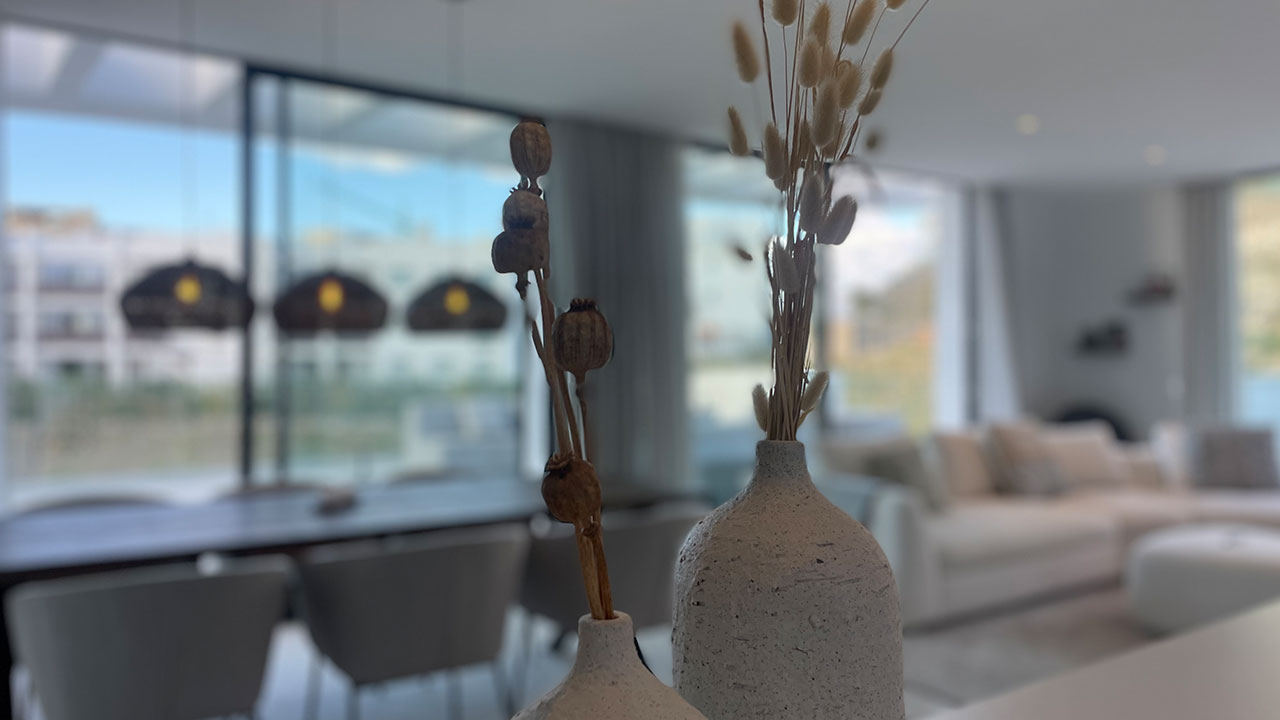 Hemmet har tre sovrum, två badrum, en extra toalett och en inredning i toppdesign med skandinavisk smak. Det stora, ljusa köket i anslutning till vardagsrummen och de enorma skjutdörrarna till den stora terrassen i sydvästläge förenar inomhus- och utomhuslivet. Här känns det som om sommaren lever för evigt och solen skiner hela dagen lång. Beläget högst upp med en fantastisk panoramautsikt över havet och grönskan får du nästan en klump i magen.